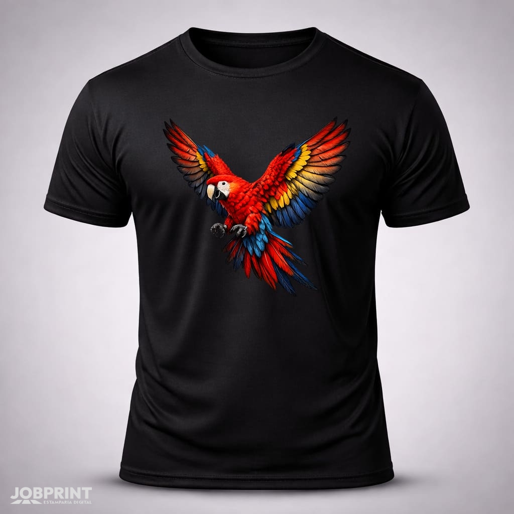 Camiseta Unissex Arara Vermelha – Coleção Brasilidades, estampada em DTF Têxtil, 100% algodão fio 30.1 penteado, 160g/m². Conforto, estilo e identidade brasileira.
