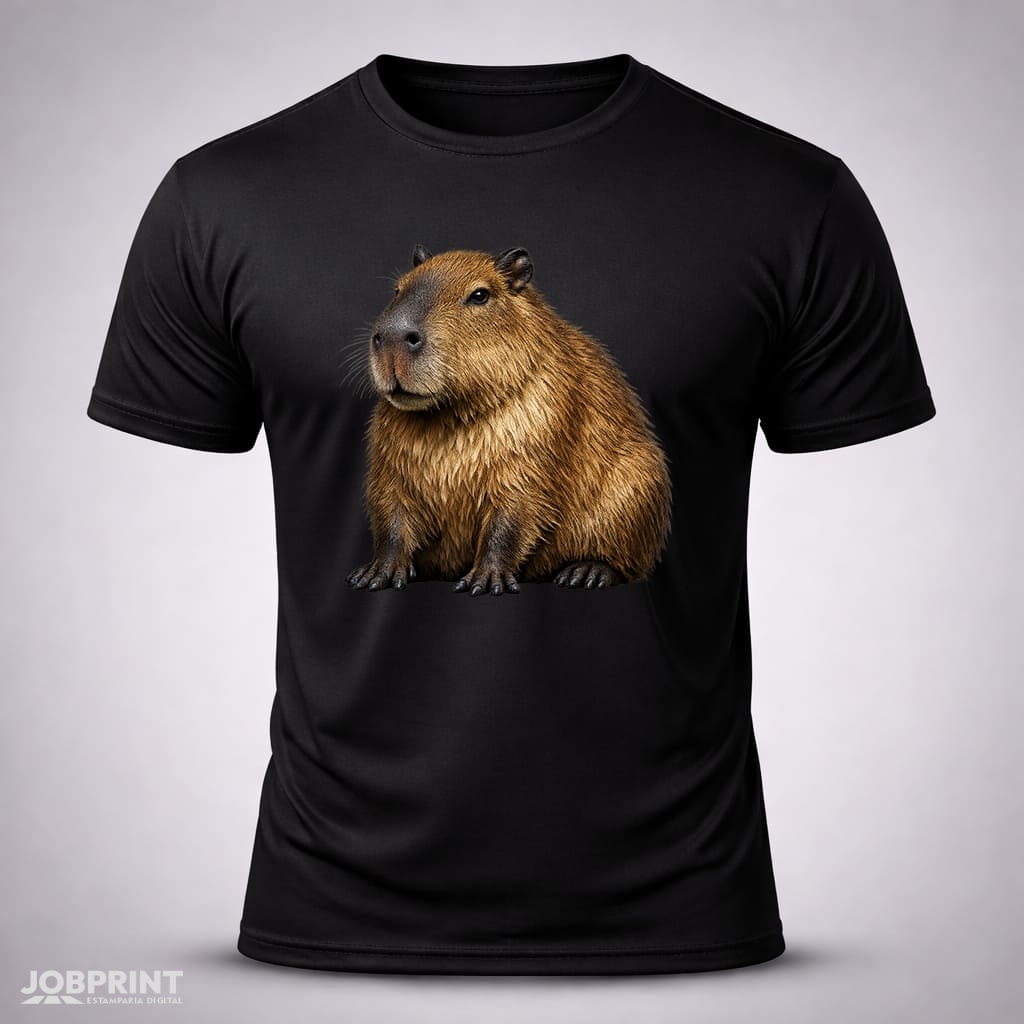 Camiseta Unissex Capivara – Coleção Brasilidades, estampada em DTF Têxtil, 100% algodão fio 30.1 penteado, 160g/m². Conforto, estilo e identidade brasileira.