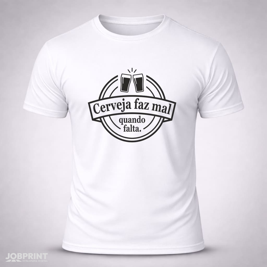 Camiseta Unissex “Cerveja faz mal quando falta.” Coleção Frases, estampada em DTF Têxtil, 100% algodão fio 30.1 penteado, 160g/m². Conforto, estilo e personalidade.