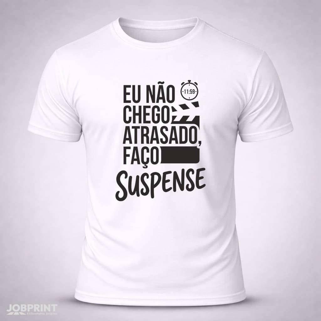 Camiseta Unissex “Eu Não Chego Atrasado, Faço Suspense.” Coleção Frases, estampada em DTF Têxtil, 100% algodão fio 30.1 penteado, 160g/m². Conforto, estilo e personalidade.