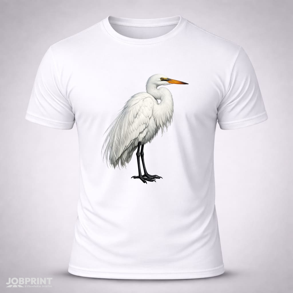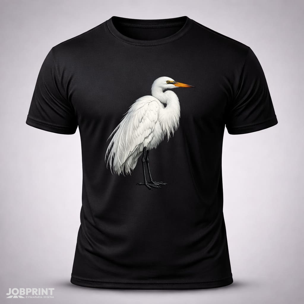 Camiseta Unissex Garça – Coleção Brasilidades, estampada em DTF Têxtil, 100% algodão fio 30.1 penteado, 160g/m². Conforto, estilo e identidade brasileira.