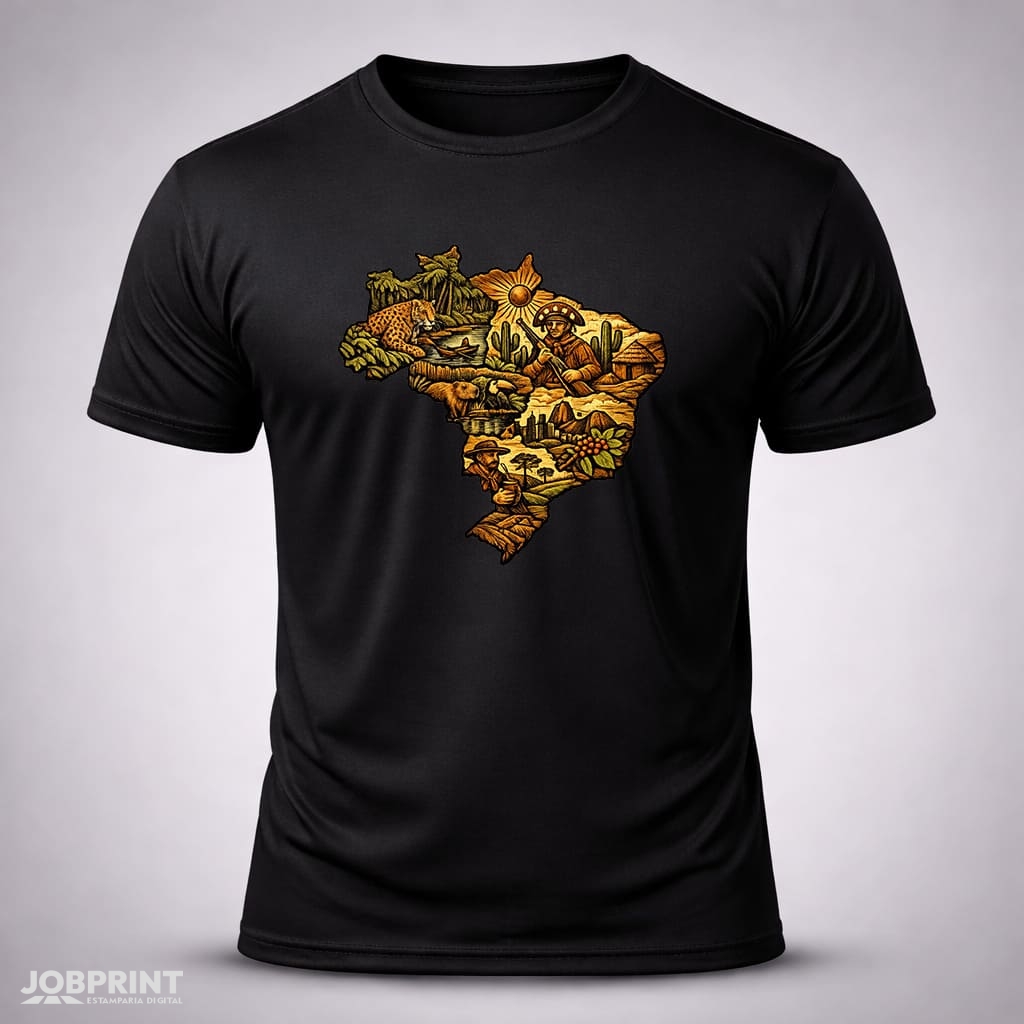 Camiseta Unissex Mapa do Brasil – Coleção Brasilidades, estampada em DTF Têxtil, 100% algodão fio 30.1 penteado, 160g/m². Conforto, estilo e identidade brasileira.