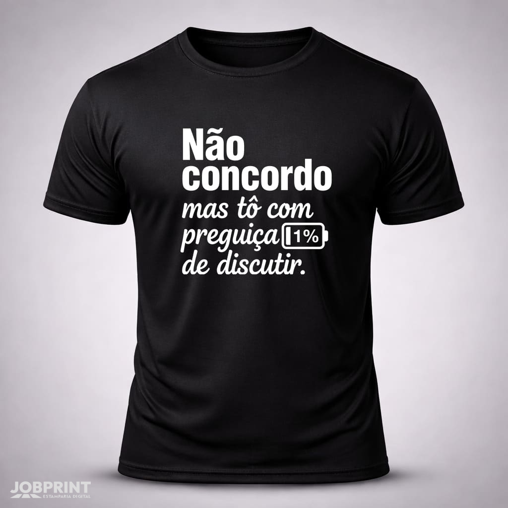 Camiseta Unissex “Não Concordo mas tô com preguiça de discutir.” Coleção Frases, estampada em DTF Têxtil, 100% algodão fio 30.1 penteado, 160g/m². Conforto, estilo e personalidade.