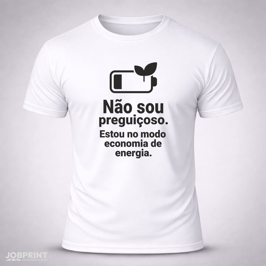 Camiseta Unissex “Não sou preguiçoso. Estou no modo economia de energia.” Coleção Frases, estampada em DTF Têxtil, 100% algodão fio 30.1 penteado, 160g/m². Conforto, estilo e personalidade.