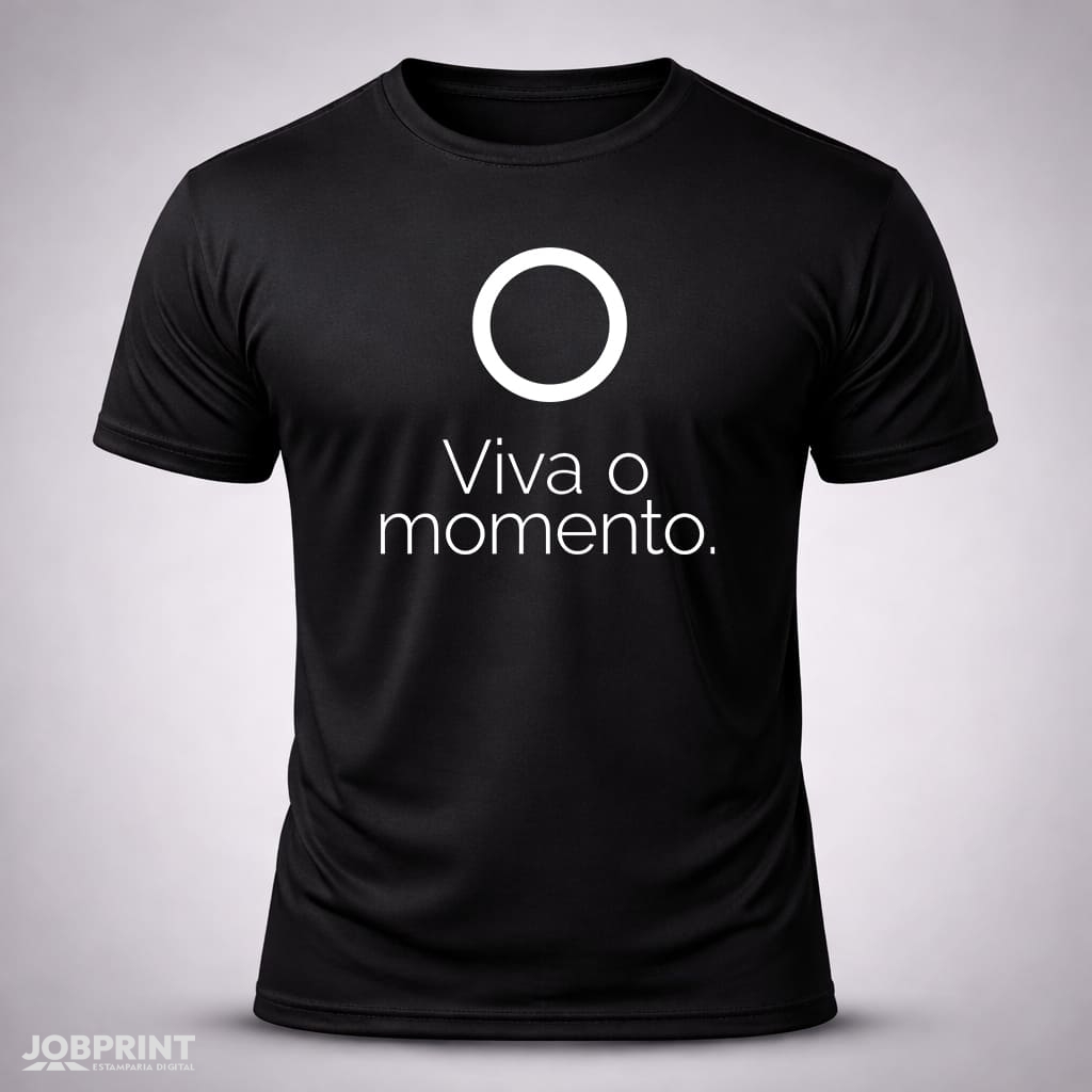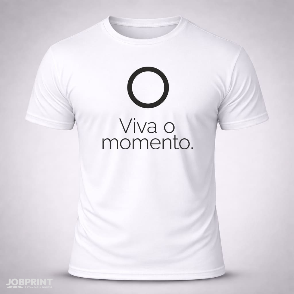 Camiseta Unissex “Viva o Momento” Coleção Frases, estampada em DTF Têxtil, 100% algodão fio 30.1 penteado, 160g/m². Conforto, estilo e personalidade.